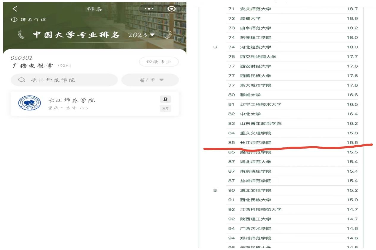 在全国212所高校开办广播电视学专业中,2023年有102所高校上榜,长江师范学院广播电视学专业位以95名上榜,如截图。