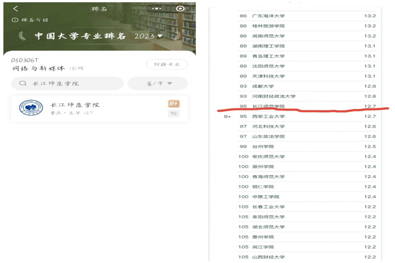 按照2023年“软科中国大学专业排名”,在全国270余所开办有网络与新媒体专业高校中,有181所高校上榜,长江师范学院网络与新媒体专业位于95位,如截图。