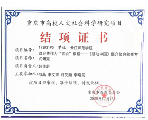 重庆市高校人文社会科学研究项目结题证书