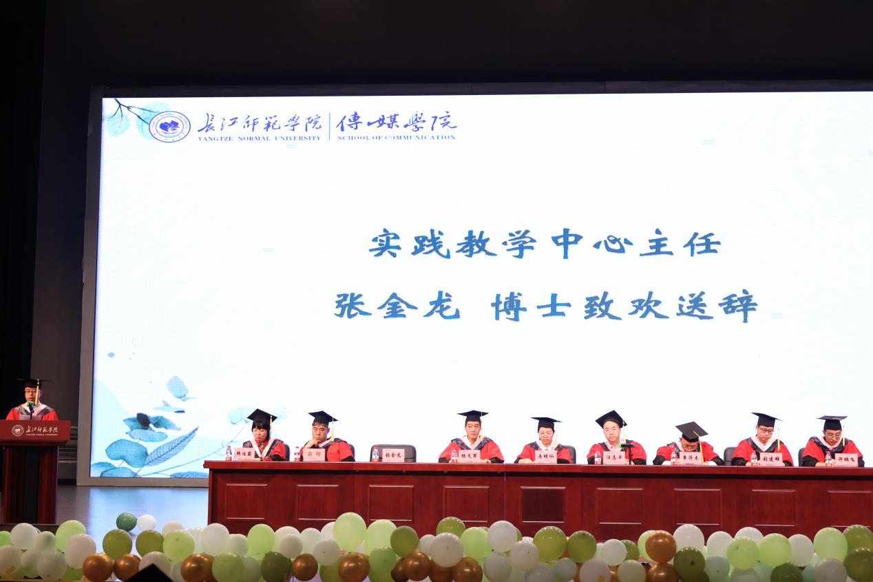教师代表张金龙博士在欢送辞中寄语毕业生们要坚守初心、不断进取,并鼓励他们为传媒事业的发展贡献自己的力量。教师代表实验中心主任张金龙博士致欢送辞,他代表全体教师向毕业生们表达了最真挚的祝福和期望。