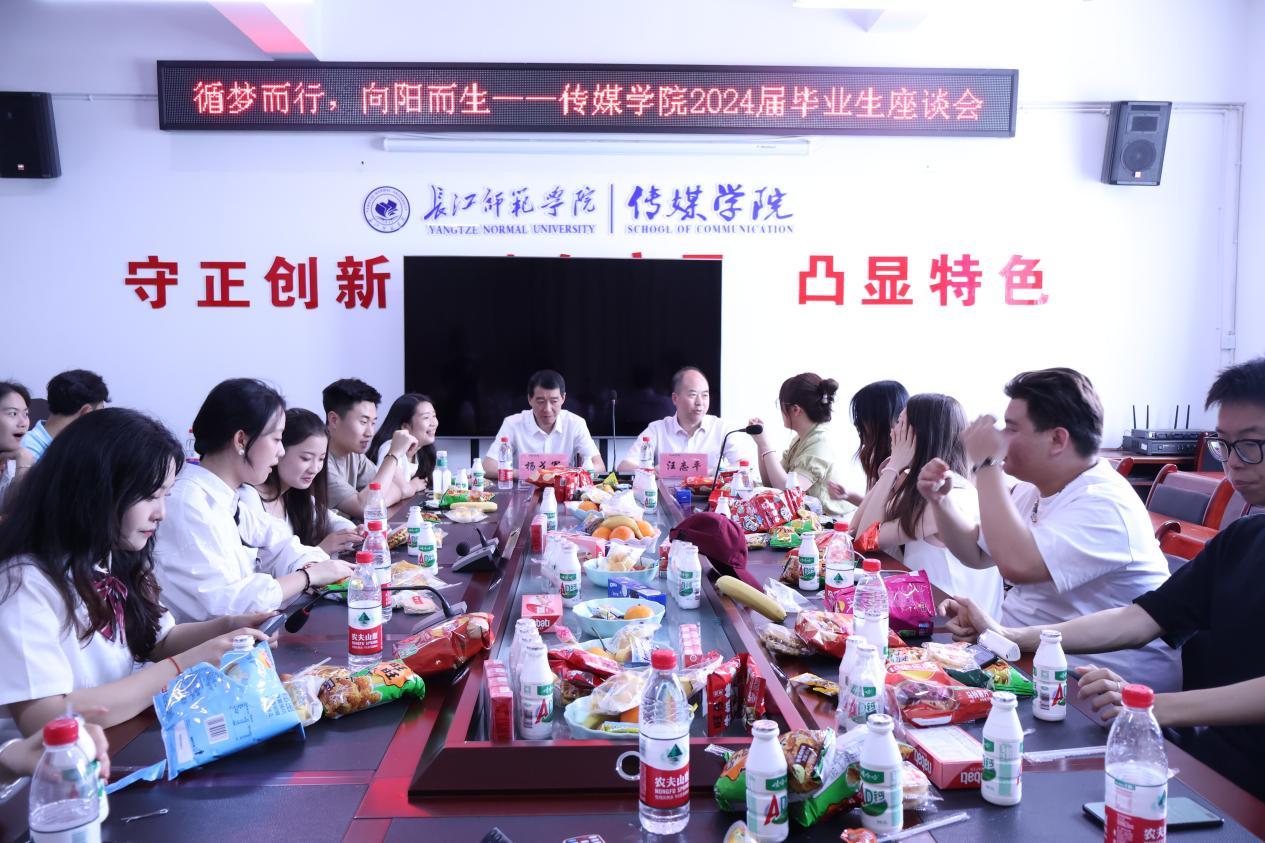 在座谈会上,老师们也对即将毕业的同学们表达了不舍与祝福。汪志平副书记表示,传媒学子充满了创造力和创新精神,无论是在课堂上还是课外活动中,都展现出了非凡的才华和优秀的品质。杨戈军副书记也对毕业生们提出了殷切的期望。他鼓励同学们在未来的道路上继续努力,不断进取。他提到,在校的经历只是人生的一小部分,而真正的人生舞台才刚刚开始。他希望大家能够保持学习的热情和动力,将一本道 所学应用到实际工作中,勇攀高峰。谭喻、甘元琴、简金雄老师也纷纷表示,这些学生不仅是他们的学生,更是他们的朋友和骄傲。他们祝愿学生们在未来的生活和工作中能够保持对知识的热爱和追求,勇敢追求自己的梦想,为社会作出更大的贡献。