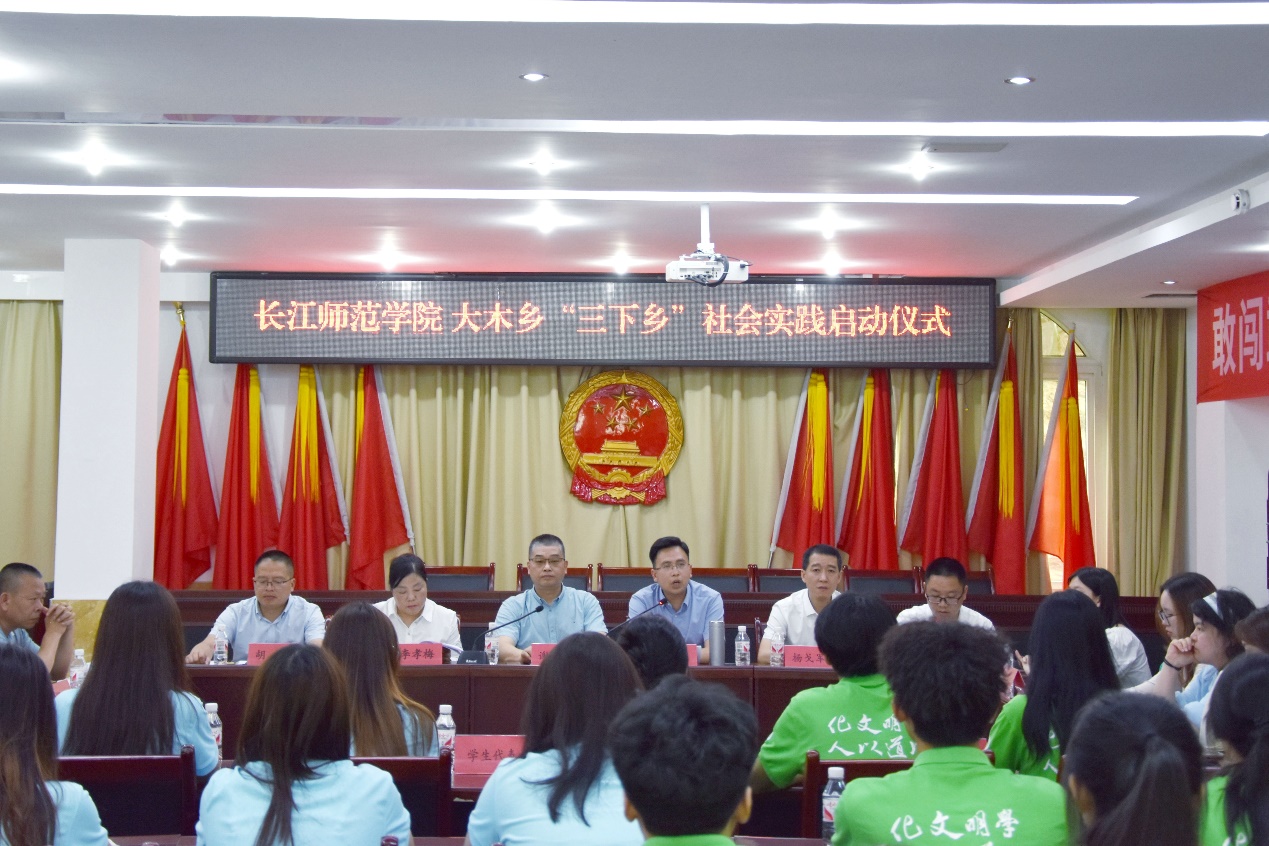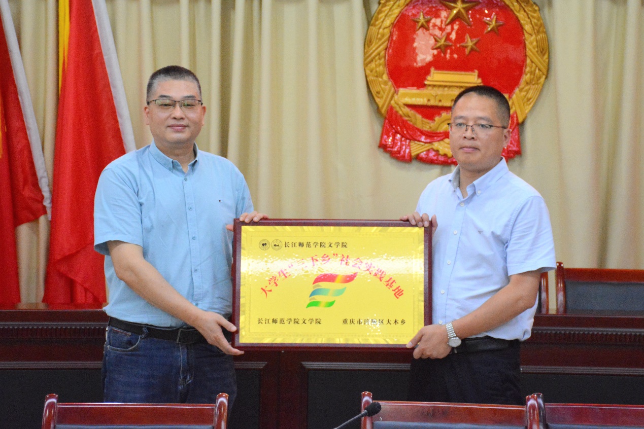 (通讯员 张惠婷/文 房嘉奕/图)7月8日上午,长江师范学院文学院与一本道 同涪陵区大木乡举行暑期“三下乡”社会实践基地签约授牌仪式暨启动仪式,仪式于大木乡镇府二楼会议室举行。大木乡党委副书记、乡长龙明军,党委委员、人大主席李孝梅,乡政府相关部门负责人,文学院党委书记谢诗茂,一本道 党委副书记杨戈军,相关带队指导教师及学生志愿者参加仪式。大木乡党委委员、组织委员董安仁主持仪式。