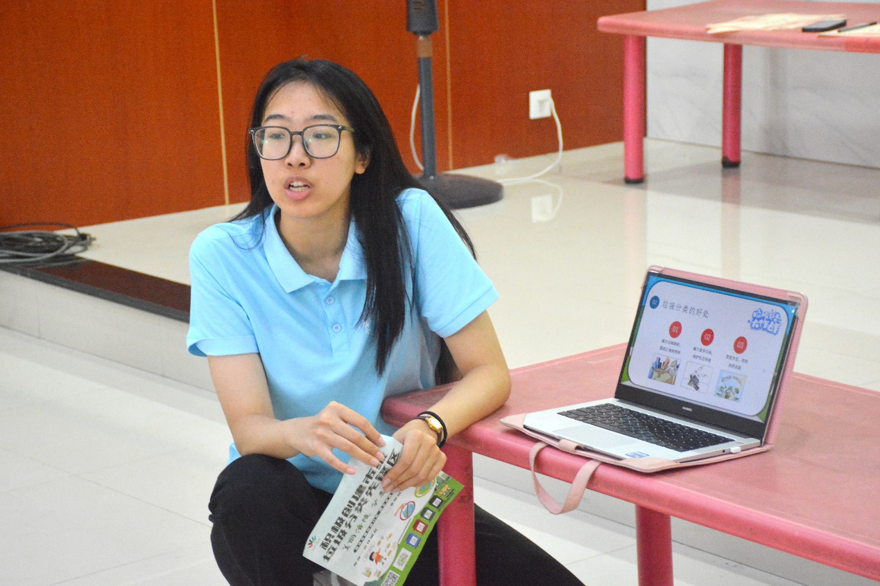 志愿者李慕雨以垃圾桶的颜色为切入点,用通俗易懂的语言,为小朋友们讲解了日常可回收物、有害垃圾、厨余垃圾和其他垃圾的分类标准和方法,普及了垃圾分类的基本知识和分类技巧,让小朋友们对垃圾分类有了更清晰的认识。同时,志愿者通过PPT演示,图文并茂地向小朋友们讲解了垃圾分类的意义、垃圾如何分类等内容。并介绍了实用小技巧,引导大家如何更简单、更快速地区分垃圾的种类。此次活动不仅在小朋友们心中种下环保的种子,也进一步深化了服务团成员对绿色可持续发展理念的理解。