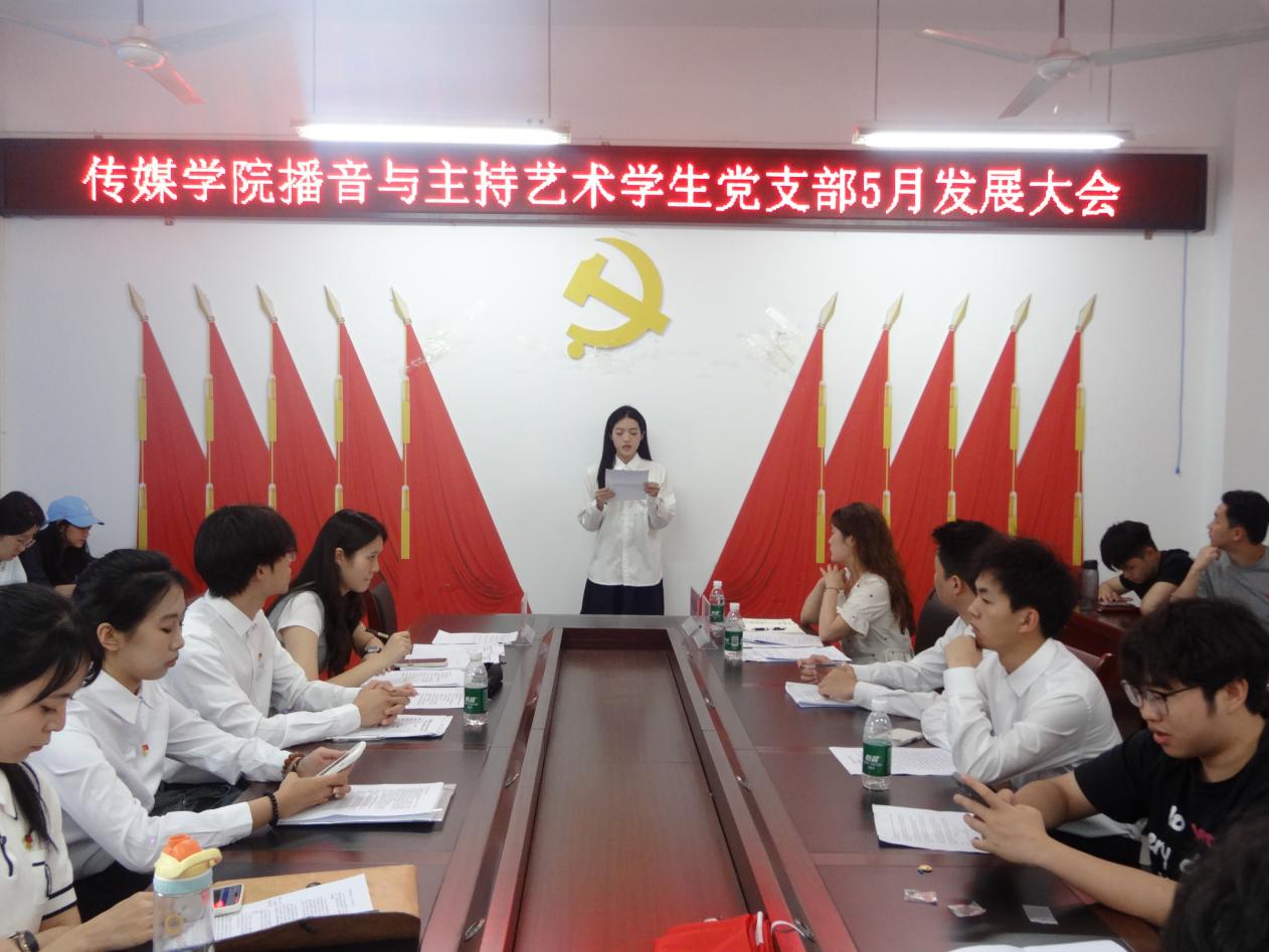 播音与主持艺术学生党支部于格致楼2318会议室召开2025年5月党员发展大会。会议由支部书记甘元琴主持,全体党员参加此次大会。