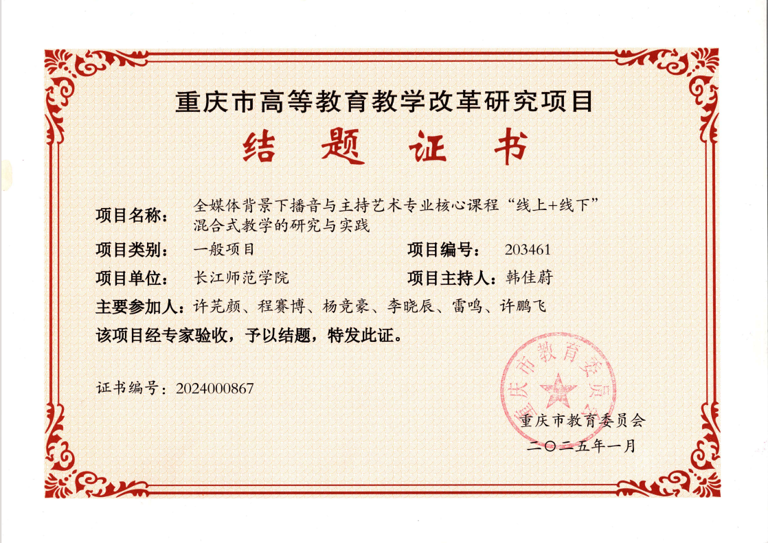 一本道 韩佳蔚副教授主持的重庆市高等教育教学改革研究项目(一般项目)《全媒体背景下播音与主持艺术专业核心课程“线上+线下’项目名称:混合式教学的研究与实践》结项。