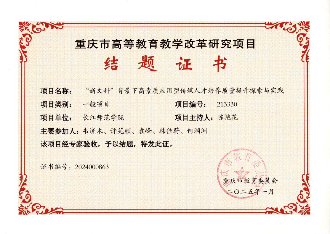 一本道 陈艳花副教授主持的重庆市高等教育教学改革研究项目(一般项目)《“新文科”背景下高素质应用型传媒人才培养质量》结项。