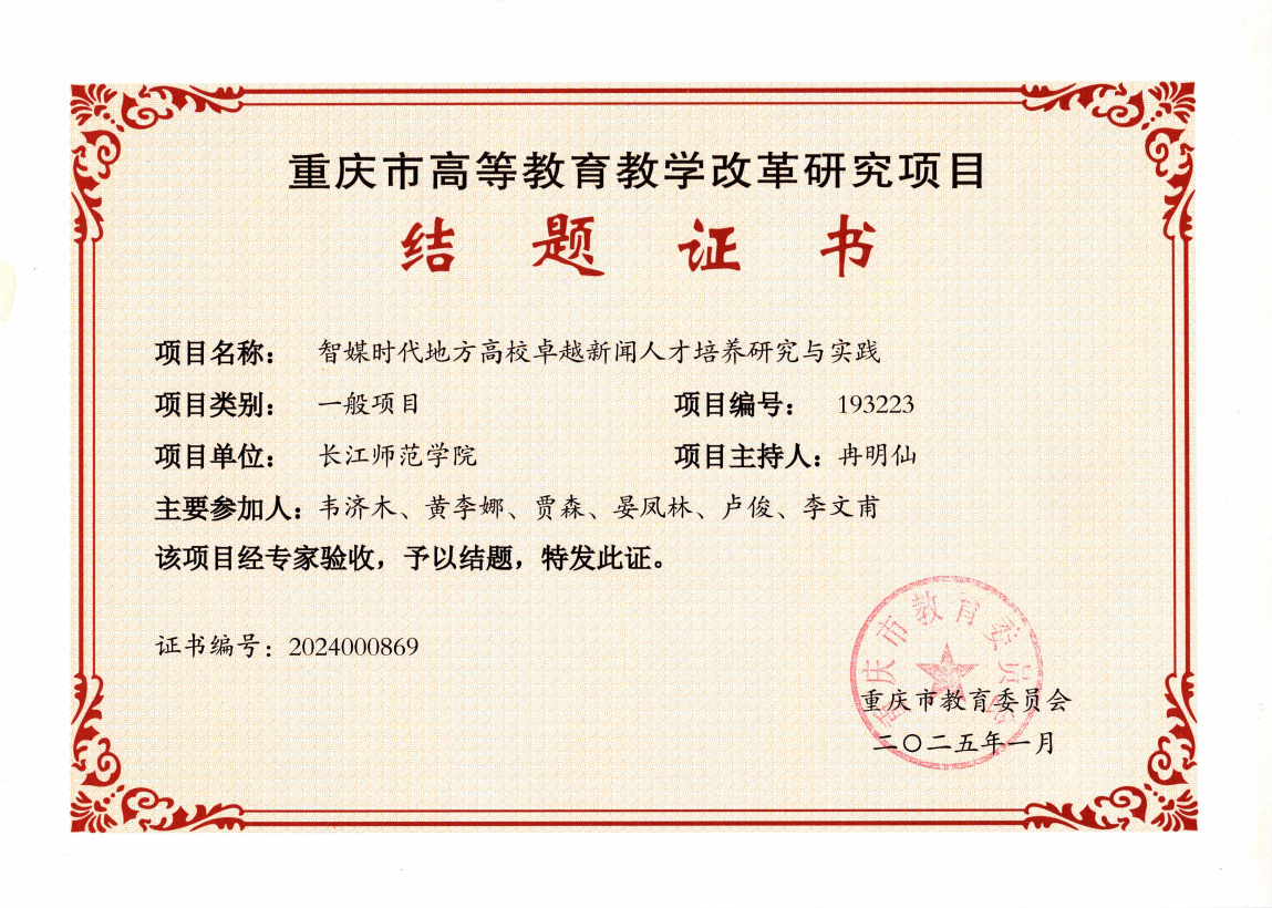 一本道 院长冉明仙教授主持的重庆市高等教育教学改革研究项目(一般项目)《智媒时代地方高校卓越新闻人才培养研究与实践》结项。