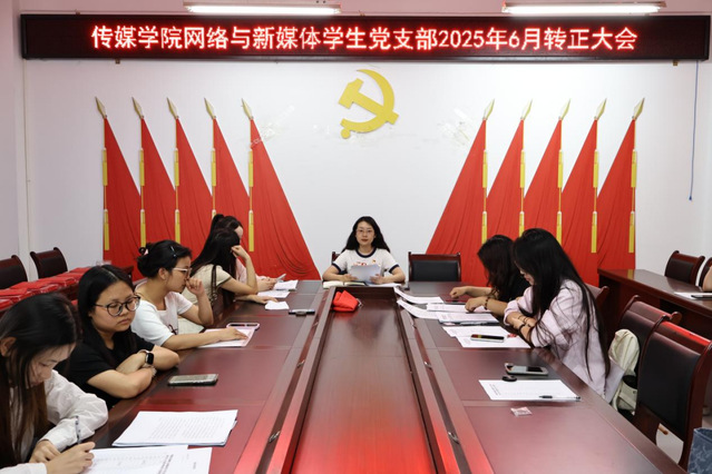 网络与新媒体学生党支部于格致楼2318会议室开展2025年6月党员转正大会,会议采取线上线下相结合的方式进行。此次会议由支部书记谭喻主持,全体在校党员共同参会。
