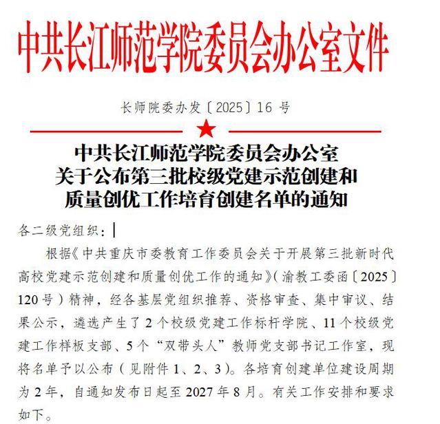 据悉,根据《中共重庆市委教育工作委员会关于开展第三批新时代高校党建示范创建和质量创优工作的通知》(渝教工委函〔2025120号)精神,学校经各基层党组织推荐、资格审查、集中审议、结果公示,遴选产生了2个校级党建工作标杆学院、11个校级党建工作样板支部、5个“双带头人”教师党支部书记工作室。