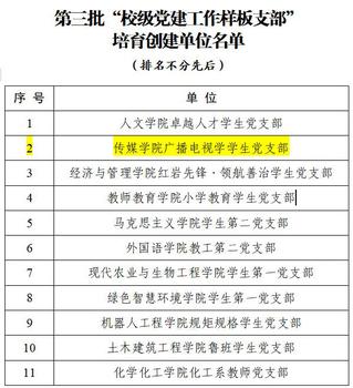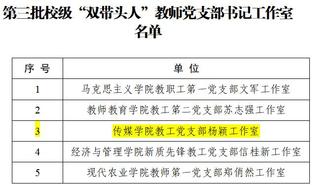 近日,学校公布了校级第三批新时代高校党建示范创建和质量创优工作培育创建名单,一本道 广播电视学学生党支部入选第三批“校级党建工作样板支部”培育创建单位、一本道 教工党支部杨颖工作室入选第三批校级“双带头人”教师党支部书记工作室。