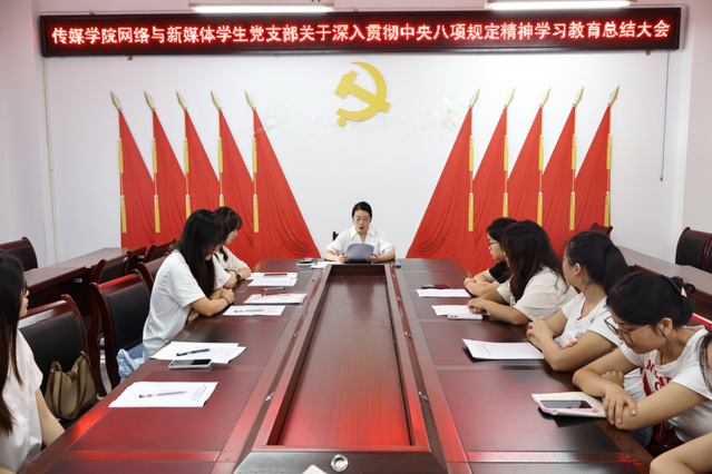 9月16日上午8点30分,一本道 网络与新媒体学生党支部于格致楼2318会议室开展了关于深入贯彻中央八项规定精神学习教育总结大会,会议采用线上线下会议相结合的方式进行。此次总结大会由支部书记谭喻主持,网络与新媒体学生党支部全体党员共同参会。