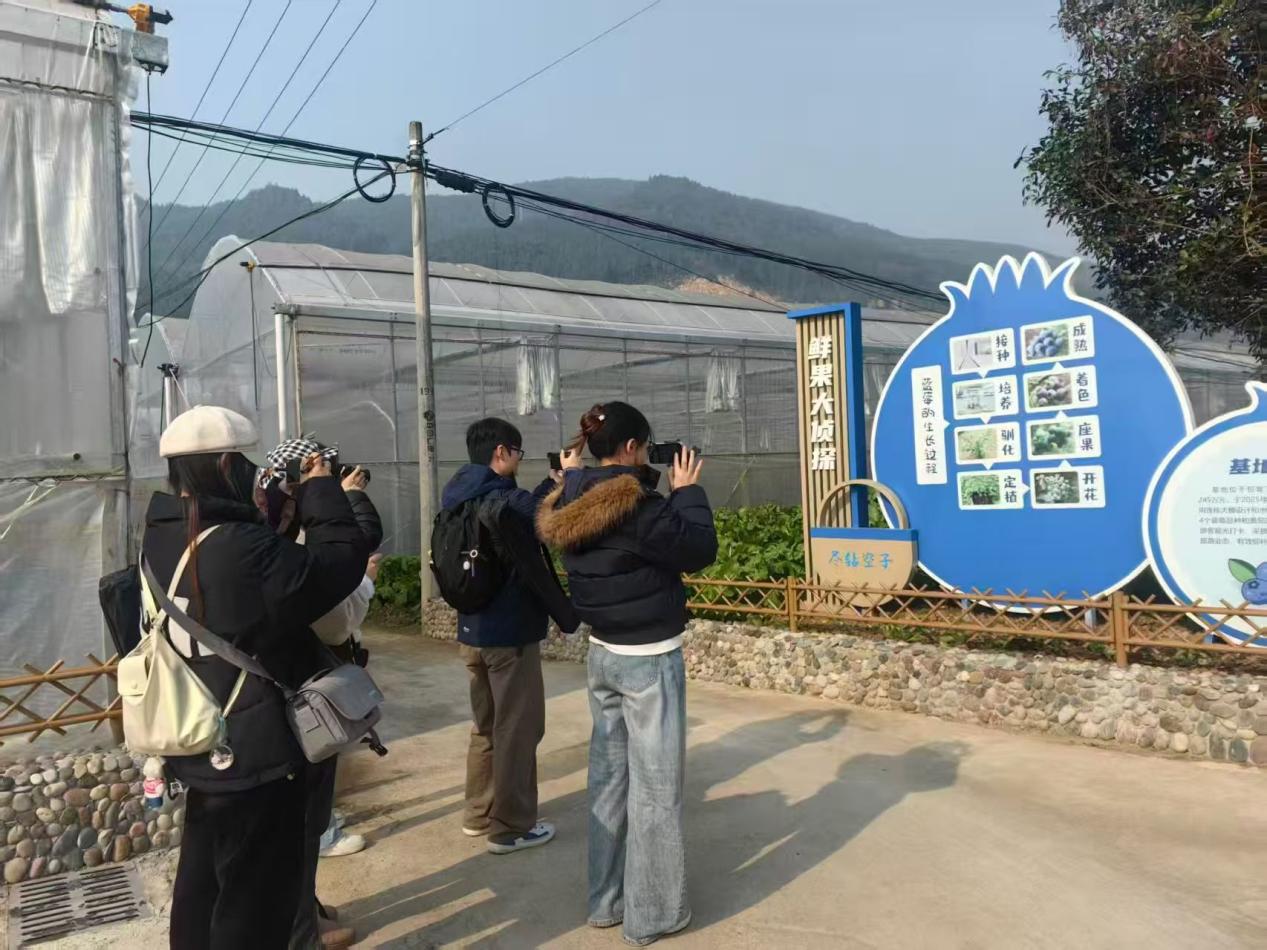 在丰都县包鸾镇政府领导的带领下,冉明仙院长及周雄兵主任一行人与长江师范学院2023级网络与新媒体全体学生走进包鸾镇花地堡村3组蓝莓基地,实地考察乡村产业发展成效。据负责人介绍,该蓝莓基地总投资245万元,于2025年4月正式完工,占地面积达25亩。基地采用先进的连栋大棚设计与水肥一体化灌溉技术,不仅成功试种4个优质蓝莓品种,还配套培育番茄、黄瓜等蔬菜作物。基地的建成不仅为当地增添了特色产业,更是创新融合农业生产与旅游发展,吸引游客前来观光打卡、参与采摘,丰富了包鸾镇乡村旅游业态,弥补了当地农文旅融合发展的短板,为农业与文旅融合推动乡村振兴提供了生动实践。
