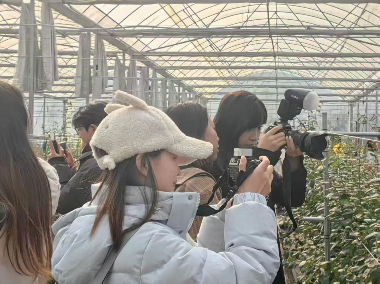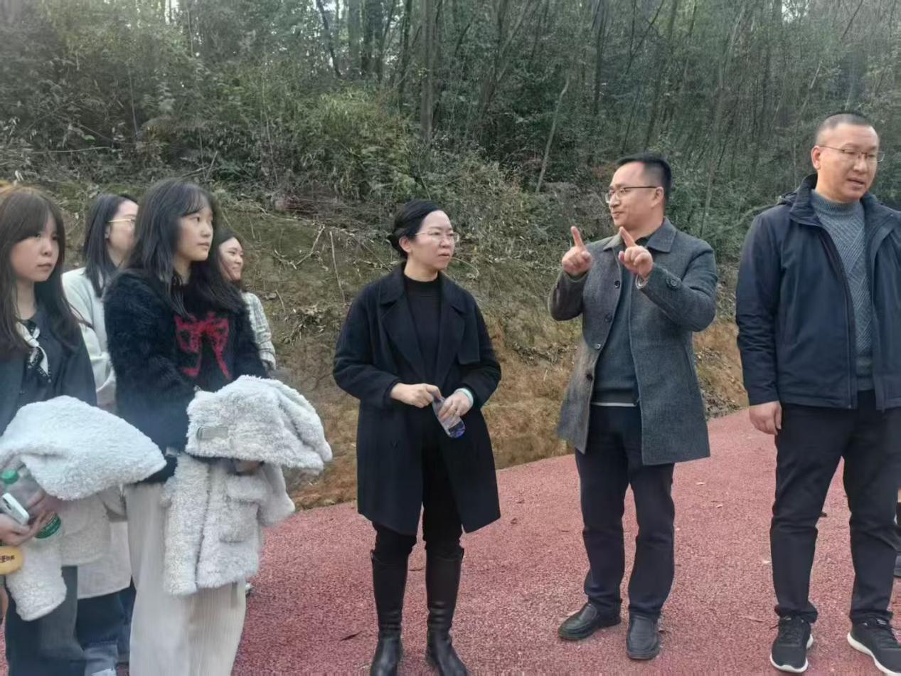 随后,同学们赴石里红枫景区、思源居、凤凰台、丰收馆等特色文旅地标走访调研。通过沉浸式体验各景点的自然风貌与人文底蕴,深入掌握包鸾镇文旅产业发展现状,为乡村振兴主题创作积累了兼具地域特色与实践价值的一手素材。在丰收馆前,冉明仙院长、周雄兵主任等校地双方代表与2023级网络与新媒体专业同学们一同合影留念,定格校地携手赋能乡村振兴的珍贵瞬间。