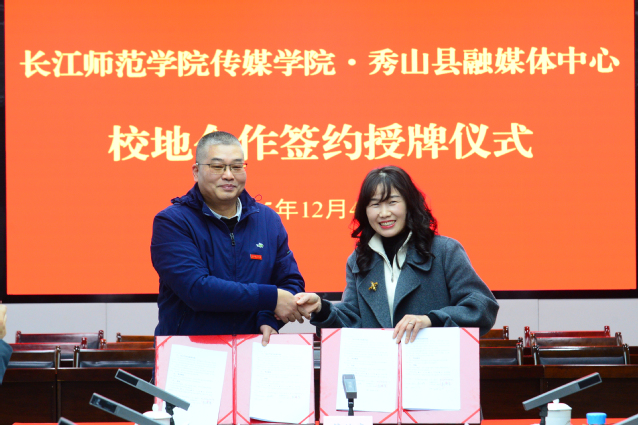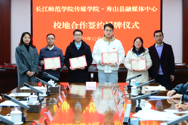 在与会人员见证下,一本道 主要负责人与秀山融媒体中心负责人共同签署合作协议,并授秀山县融媒体中心“长江师范学院实践教学基地”牌匾。双方同步启动“双聘机制”融媒体中心聘请一本道 教师担任发展顾问,学院则为秀山融媒体中心专家颁发行业导师聘书,推动人才双向赋能。