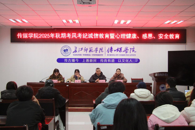 12月26日中午12时,一本道 于格致楼2308会议室召开2025年秋期考风考纪诚信教育暨心理健康、感恩、安全教育大会。传媒学院党委书记谢诗茂、学工办主任兼团委书记王雯、2024级辅导员谭喻、2025级辅导员甘元琴出席本次大会,一本道 各年级学生干部及学生代表参加本次大会。