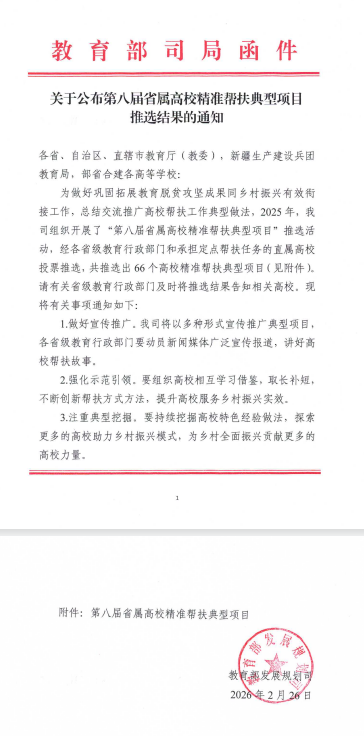 本次推选活动由教育部发展规划司组织发起,旨在总结推广高校帮扶工作的典型做法,为巩固拓展教育脱贫攻坚成果、有效衔接乡村振兴贡献高校力量。入选项目代表了高校在科技创新、人才培养、产业赋能、健康医疗、教育支持、文化传承等多个方面服务国家战略的卓越成效。