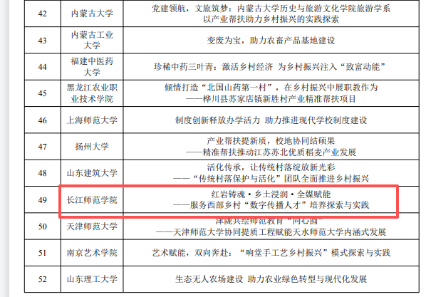 近日,教育部发展规划司公布了第八届省属高校精准帮扶典型项目推选结果。在全国共66个入选项目中,重庆市在精准帮扶与乡村振兴领域取得优异成绩,共有2项教学成果成功入选,其中长江师范学院的《红岩铸魂·乡土浸润·全媒赋能 服务西部乡村“数字传播人才”培养探索与实践》项目(序号49)获得国家级认可,成为高校服务乡村全面振兴的先进典型。